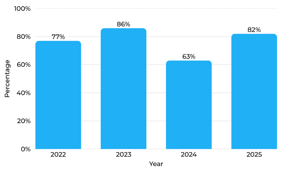 | 2021 – 2022 | 89% | 52% | 58% | 38% | *N | 37% |